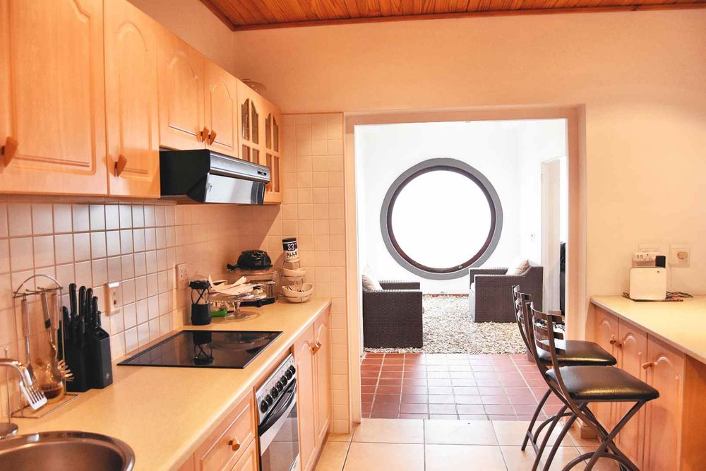 - The kitchen is fitted with ample built-in cupboards, along with a built-in oven and stove.